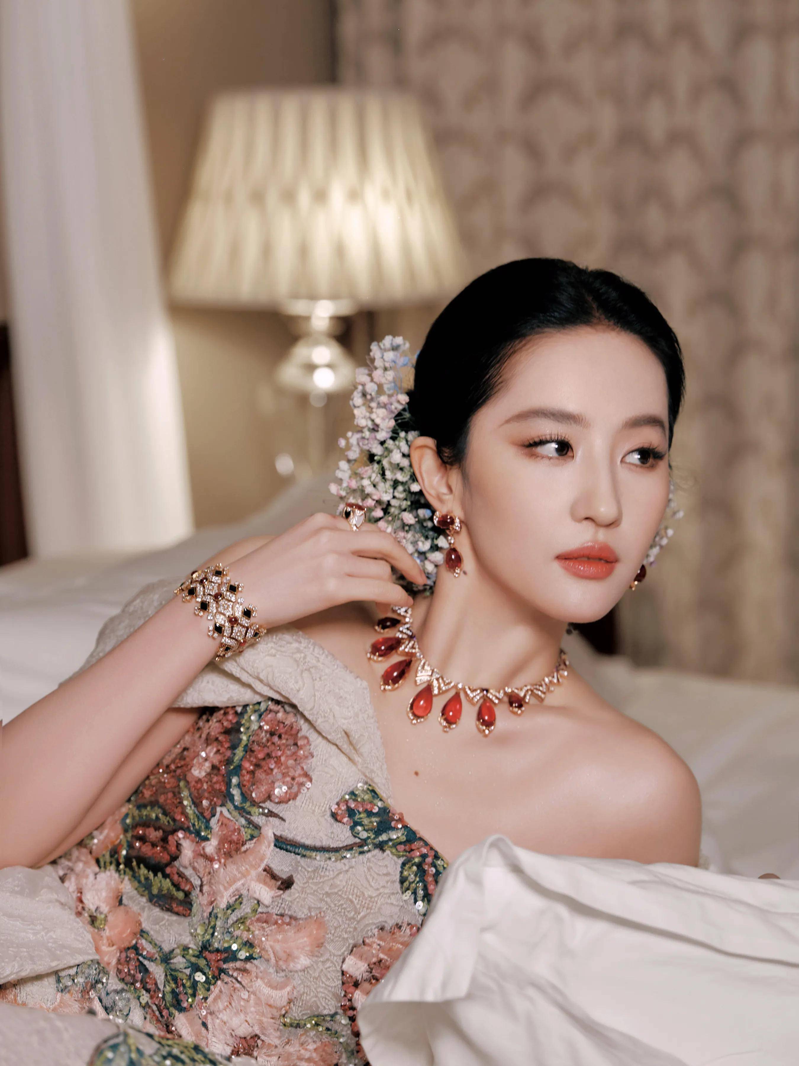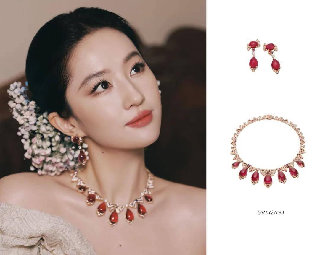 刘亦菲戴了一整套的宝格丽红宝石首饰,红宝石像大颗雨滴般散落在她漂亮的脖颈间,但是她这张脸太美了,任谁看了都会忽视这套珠宝。刘亦菲的美夺人心魂,大家眼里只看到了她得美貌,在华丽的珠宝也成了陪衬。